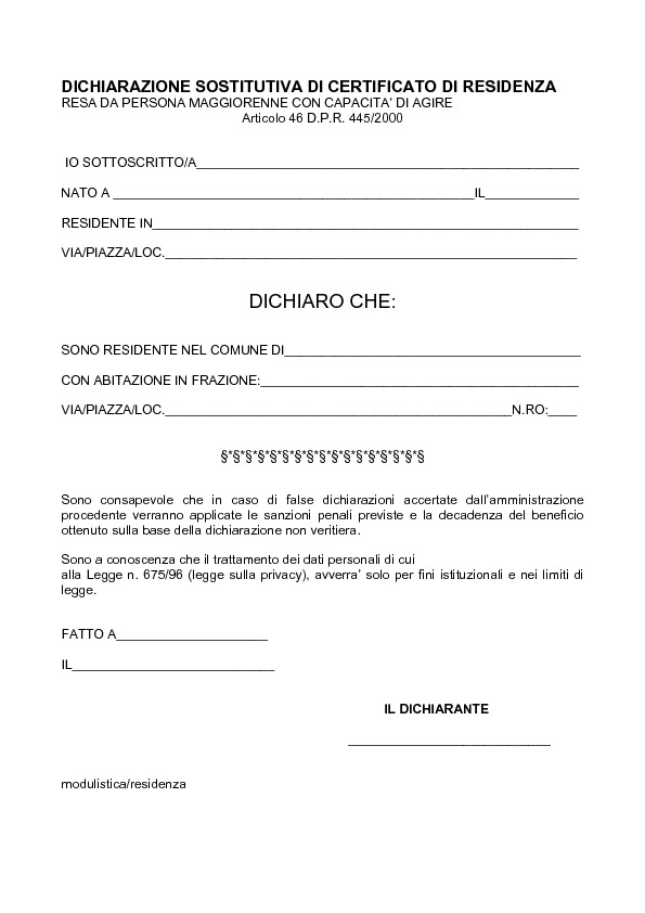 Dichiarazione sostitutiva di certificato di residenza resa da persona maggiorenne con capacità d'agire